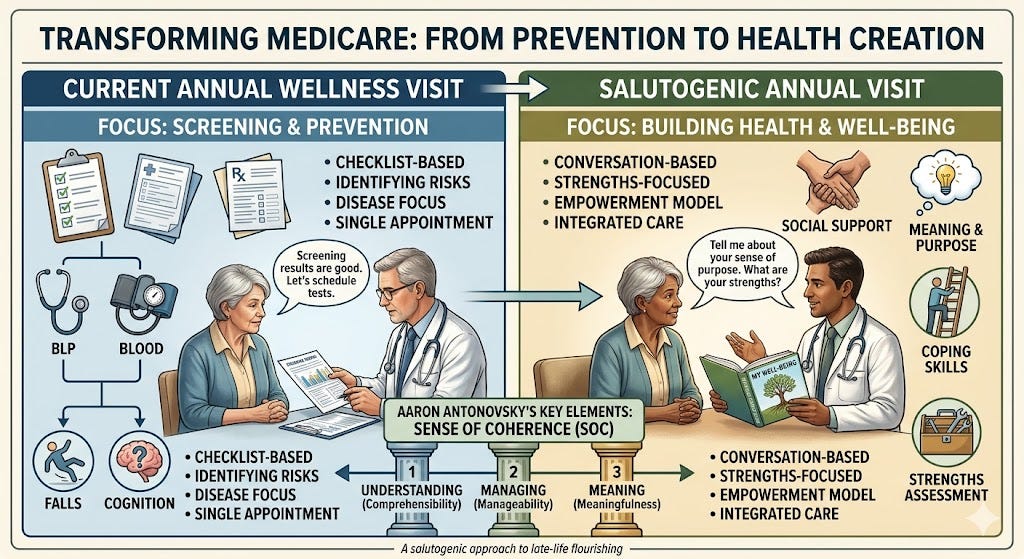 The Medicare Annual Wellness Visit should therefore be reimagined. Prevention should remain part of it, but prevention should no longer be the whole story. The visit should become a gateway to late-life health creation: a yearly opportunity to strengthen older adults’ capacity to live lives that are understandable, manageable, meaningful, and socially connected. In other words, CMS should redesign the AWV around a salutogenic rather than merely pathogenic frame.